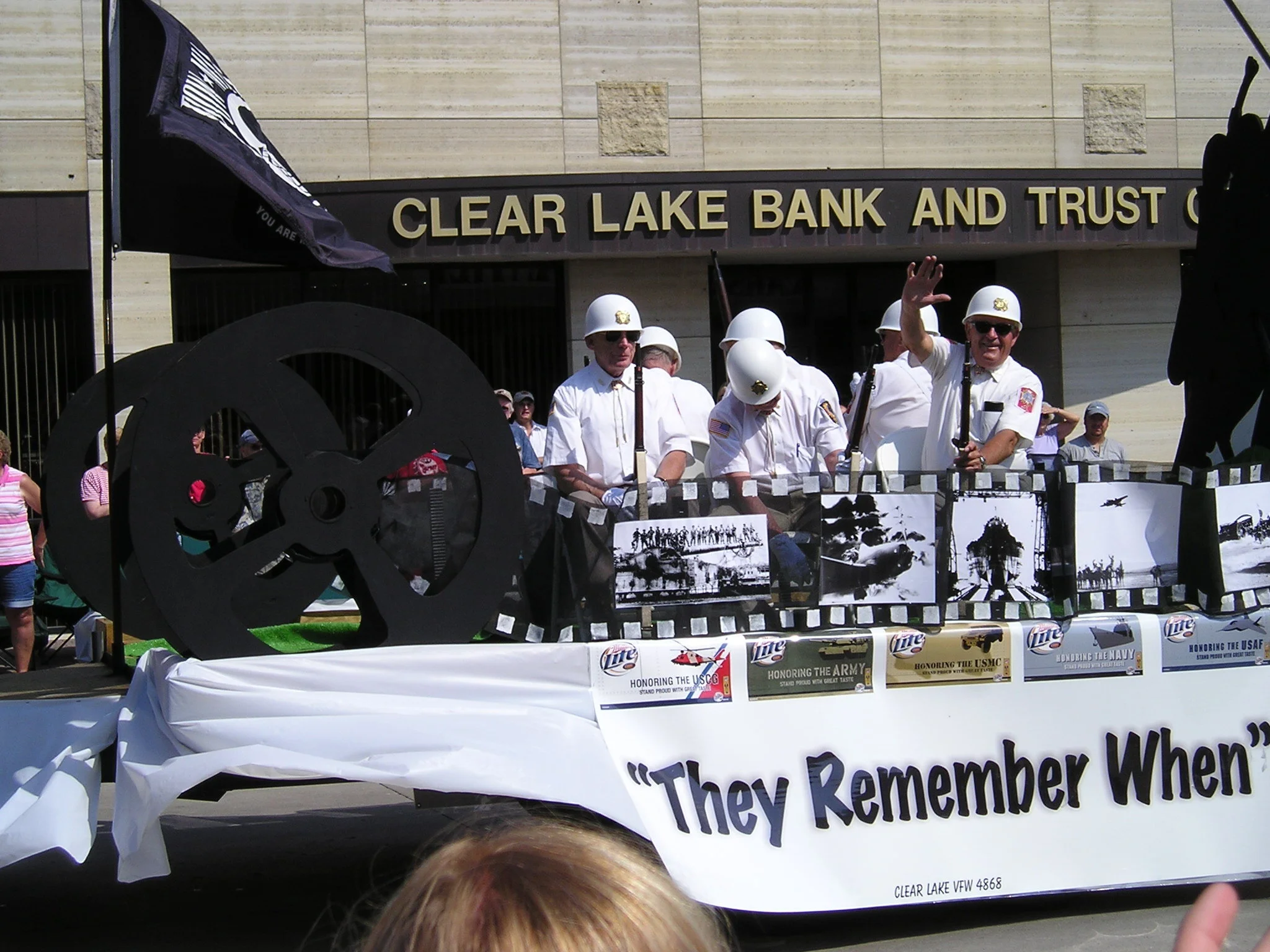Dad (waving) from the VFW float in the Clear Lake Fourth of July parade, 2002